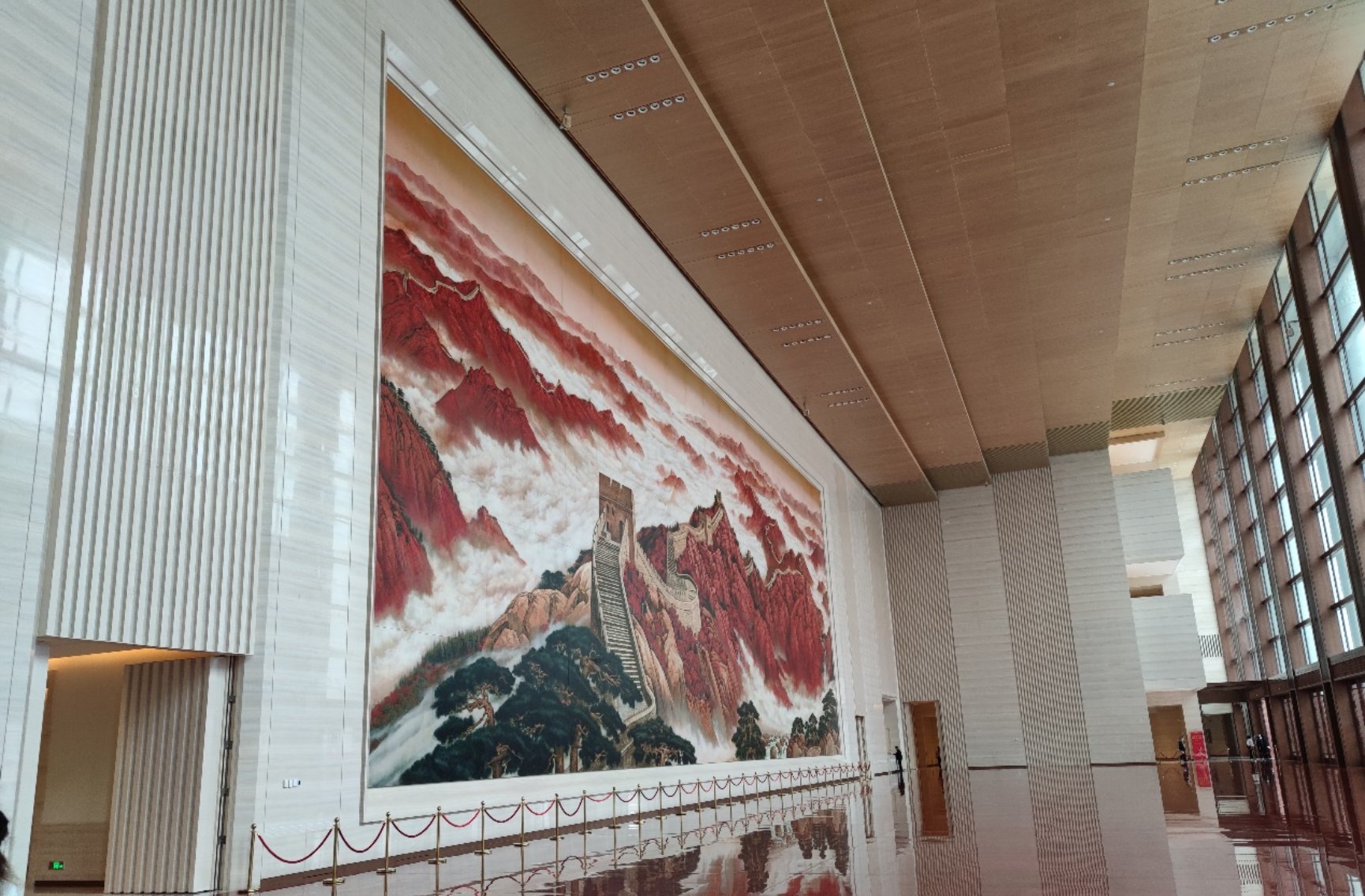 走进展馆序厅,一幅壮丽雄浑的巨大壁画令人心潮澎湃,画中既有祖国辽阔的大好河山,又有气势宏伟的烽火台、长城,暖红色映照着旭日东升……