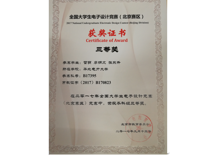 2017.08 全国大学生电子设计竞赛 北京市三等奖