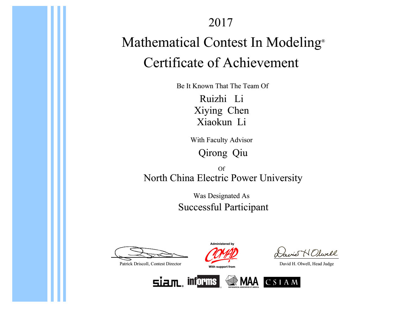 我目前获得了美国大学生数学建模竞赛三等奖。对于比赛我认为兴趣是最好的老师。关于建模,我觉得困难的地方在于知识综合性较强,队员之间要分工合理,分别突破各项难点。