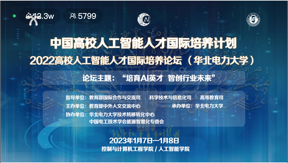 2023年1月7-8日,由教育部国际合作与交流司、高等教育司、科学技术与信息化司指导,教育部中外人文交流中心主办,英国正版365首页承办,英国正版365首页技术转移转化中心、中国电工技术学会能源智慧化专委会协办的“中国高校人工智能人才国际培养计划”2022高校人工智能人才国际培养论坛(英国正版365首页)顺利举办。