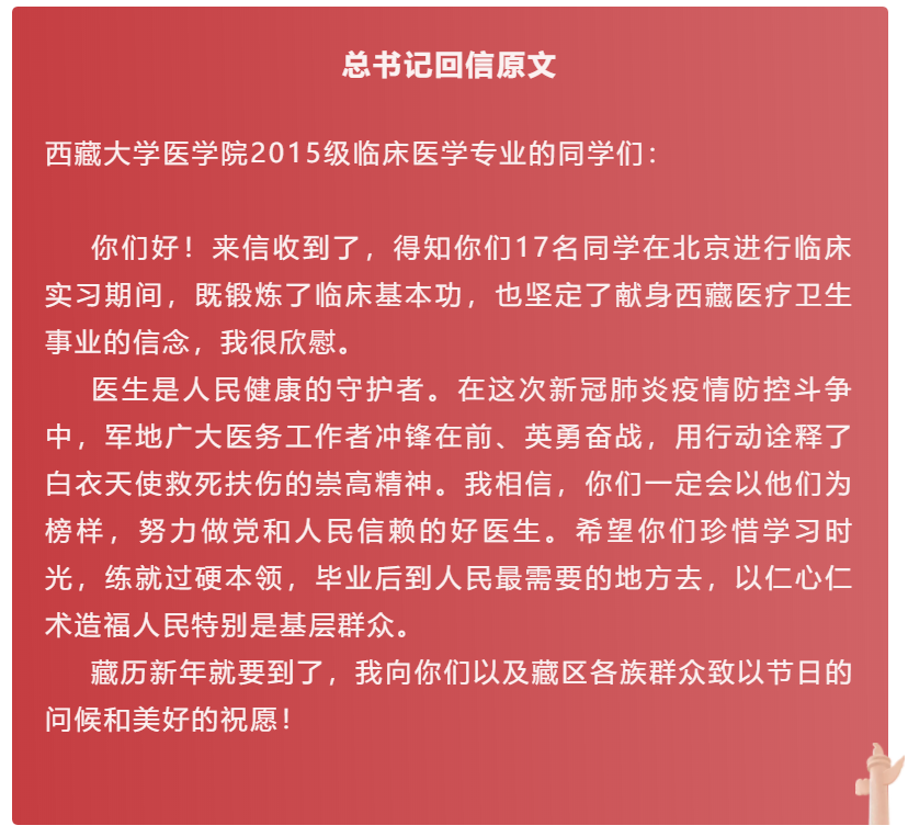 在疫情防控的关键时期,获悉习近平总书记给在首钢医院实习的西藏大学医学院学生回信,让我们在校大学生(因为疫情在家学习)备受鼓舞。作为当代大学生,总书记的回信,更坚定了我们努力学习,为国家做贡献的信心和决心。我们一定会振奋精神、砥砺前行,聚焦重点任务,强化责任担当,继续做好大学生该做的事情,以务实之举做实搞好学习,以实际成效回报总书记的关心、回报党中央的关怀。