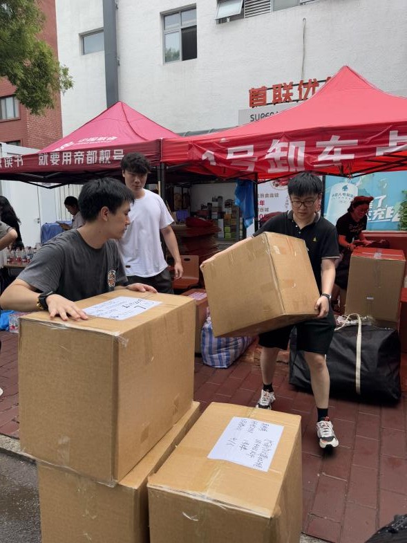 风雨无阻,倾力相助。7月10日,志愿者们重点承担了行李卸车、搬运和秩序维护任务。雷阵雨天气给运输和搬运带来不小挑战,志愿者们身着雨衣坚守岗位,他们甚至主动加班加点,以确保行李转运任务顺利完成。他们还自发帮助16号楼和13号楼的女生将行李搬运至宿舍,生动诠释了“薪火控计人”的互助精神,深深感动了现场师生。
