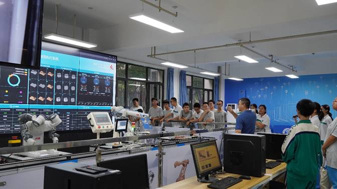 在智能制造实验室,于磊老师操作电力变压器智能装配生产流水线系统,演示了ABB工业机器人执行零部件装配、装盒等工序的全流程,并结合实体设备与仿真操作讲解了工业机器人在生产线的实际应用,为学生们展示了智能制造的最新技术与未来趋势。
