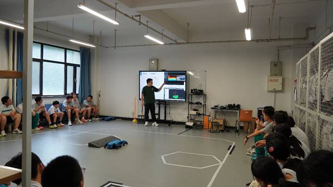 在机器人综合实验室,于田老师为同学们展示了四足机器狗的多模态运动能力,现场表演了前进、跳跃、跨越障碍等动作,讲述了机器人在日常生活、工业巡检、危化品处理等的技术优势,激发了孩子们对AI技术和未来应用的无限畅想。