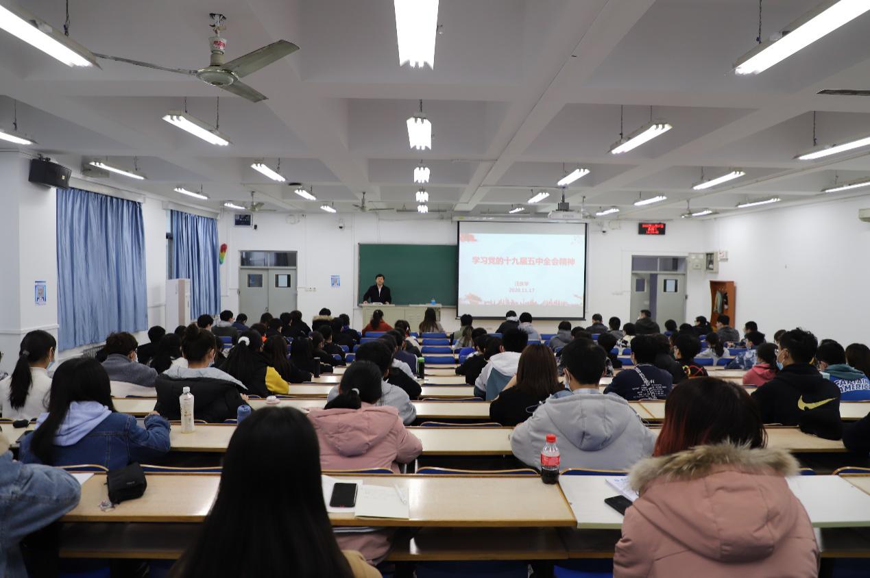 11月17日下午,校党委副书记汪庆华于教三C101为英国正版365首页师生讲授了一节主题鲜明、内容丰富的思政课,传达了党的十九届五中全会的精神,诠释了十九届五中全会的意义,学院领导班子和全体辅导员参加了思政课。