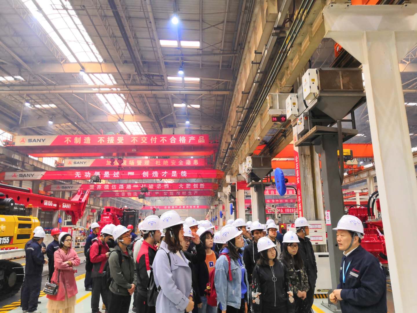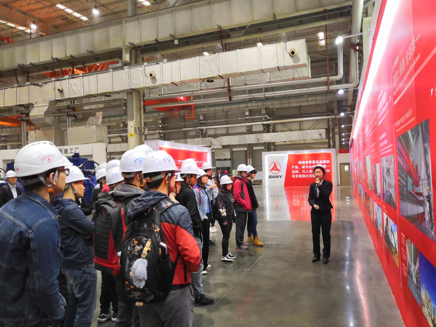 参观开始前学院师生首先通过展板了解了三一重工的历史发展和企业文化。20世纪80年代的中国正处在第二轮改革的发轫期,湖南省七星镇洪源机械厂里的大学生梁稳根,和他几个志同道合的伙伴毅然辞去了安稳的工作,怀抱着做中国经济试验田的理想开始了自己的实业报国之路:他们成立了涟源茅塘焊接材料厂,这便是今天三一集团的前身。自成立以来,三一集团秉持“创建一流企业,造就一流人才,做出一流贡献”的企业宗旨,打造了业内知名的“三一”品牌。今天,三一重工已经发展为中国最大、全球第五的工程机械制造商,也是全球最大的混凝土机械制造商,业务和产业基地遍布全球。