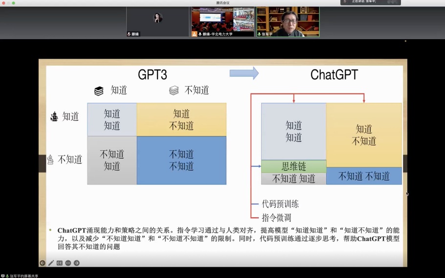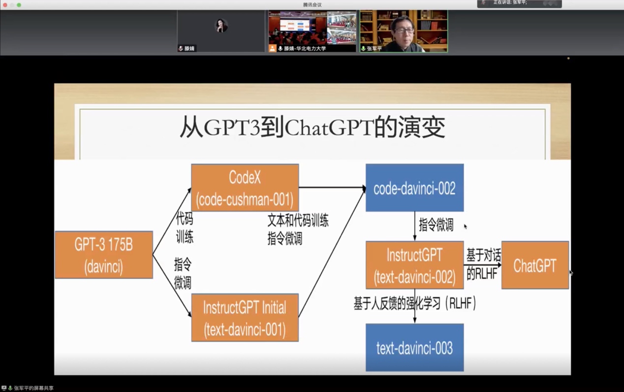 张军平教授通过生动翔实的介绍,深入浅出地阐述了ChatGPT模型的演变历史,尤其着重介绍了GPT3到ChatGPT的演变,强调了ChatGPT在归纳、纠错、创造性等方面相较于前几代模型的优势。