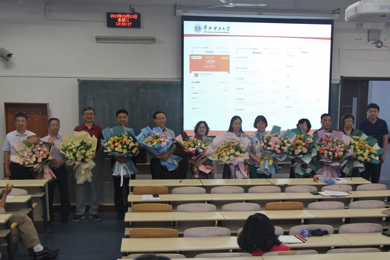 随后学院对从教三十年的在职教师进行统一表彰。刘书记、房院长为受表彰的教师颁发纪念品、献花,并合影。