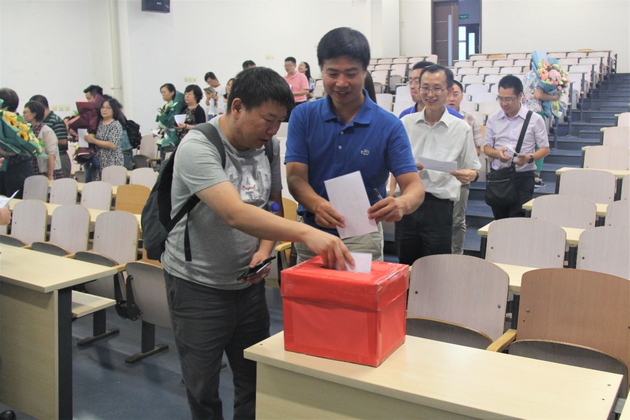 匿名投票环节,与会教职工认真填写测评表,并统一投入票箱。